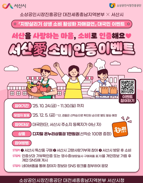 이벤트는 ▲서산시 특산품 구매 인증 ▲고향사랑기부제 기부 ▲서산시 관광지·축제·전통시장 방문 중 한 가지에 참여하면 선착순 100명에게 디지털 온누리상품권 1만 원을 제공한다.
