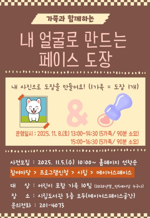 이번 프로그램은 노트북을 활용해 자신의 얼굴 사진을 편집하고, 이를 도장으로 제작하는 과정을 체험하는 수업으로, 참여 가족은 세상에 하나뿐인 나만의 도장을 완성하게 된다.