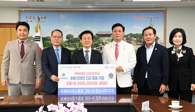 [뉴스다컴] 국제라이온스협회 355-E(경남서부)지구(총재 백인구)는 지역 내 돌봄 사각지대 아동 과 수해 피해 주민을 돕기 위해 1000만 원 상당의 물품을 진주시복지재단(이사장 이성갑)에 기탁했다.