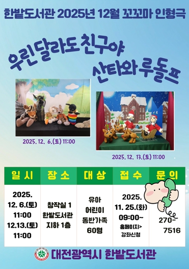 김혜정 한밭도서관장은 “이번 인형극을 통해 아이들이 서로를 이해하고 존중하는 마음을 배우며, 연말의 따뜻한 상상과 즐거움도 함께 느낄 수 있기를 바란다. 앞으로도 아이들의 정서 발달과 문화 체험을 위한 다양한 프로그램을 지속적으로 마련하겠다”라고 전했다.