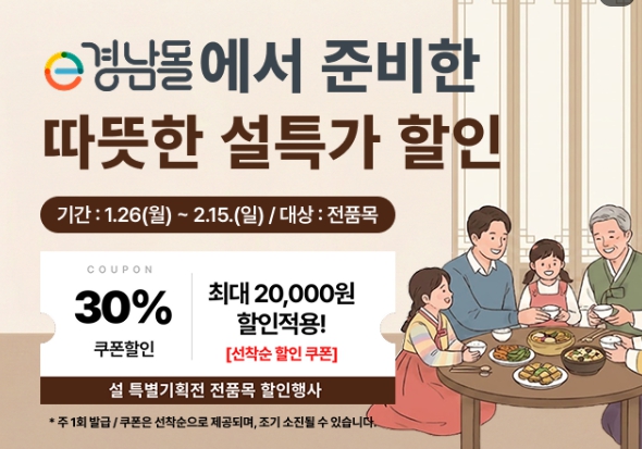 [뉴스다컴] 경상남도와 (재)경상남도투자경제진흥원이 운영하는 e경남몰은 1월 26일부터 예산 소진 시까지 ‘2026년 풍성한 설맞이 할인 기획전’을 진행한다.