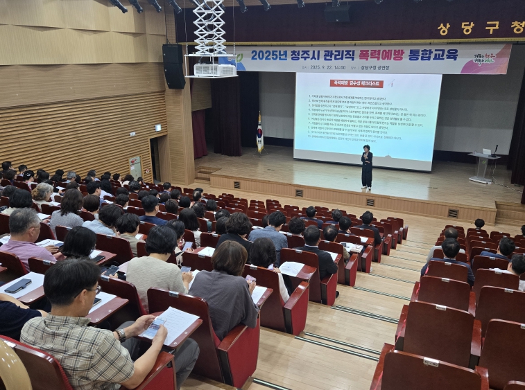 [뉴스다컴] 청주시는 22일 상당구청 대공연장에서 시 기관장과 고위직 공무원 185명을 대상으로 직장 내 4대 폭력(성희롱,성매매,성폭력,가정폭력) 예방 통합교육을 실시했다.