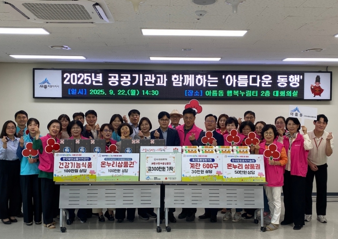 [뉴스다컴] 세종특별자치시 아름동지역사회보장협의체(공동위원장 이인환·조형관)가 22일 아름동 행정복지센터에서 관내 공공기관과 함께 추석맞이 후원 기탁식 ‘아름다운 동행’을 개최했다.