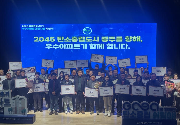 [뉴스다컴] 광주광역시는 11일 광주디자인진흥원 이벤트홀에서 ‘2025 광주온도낮추기 우수아파트 시상식’을 열고, 탄소중립 생활 실천 활동에 참여한 우수아파트 54곳을 시상했다.