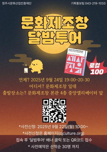 [뉴스다컴] 청주시문화산업진흥재단이 22일 오전 10시부터 ‘문화제조창 달밤투어’ 9월의 두 번째 투어객 모집에 들어간다.