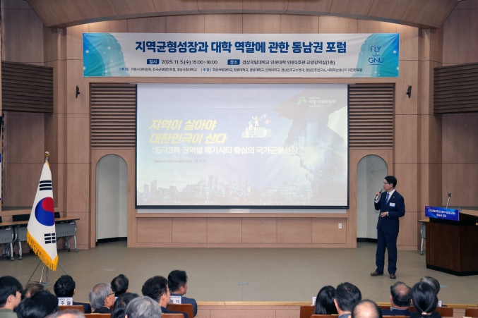 [뉴스다컴] 경상국립대학교는 11월 5일 오후 3시 가좌캠퍼스 인문대학 교양강의실에서 ‘지역균형성장과 대학 역할에 관한 동남권 포럼’을 개최했다.