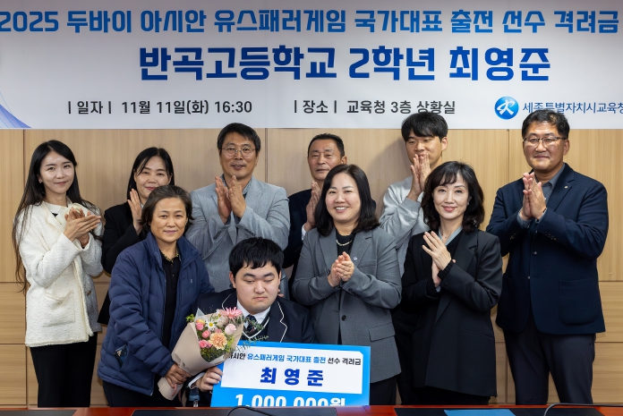 [뉴스다컴] 세종특별자치시교육청은 반곡고등학교 2학년 최영준 학생이 12월 7일부터 14일까지 아랍에미리트 두바이에서 열리는 ‘두바이 2025 Asian Youth Para Games(아시안 유스패러게임)’ 뇌병변장애(F33) 원반던지기 종목에 국가대표로 출전함에 따라 함께 축하하고 격려했으며, 지원금 100만 원을 전달했다고 밝혔다.