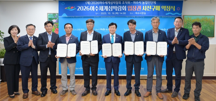 [뉴스다컴] (재)2026여수세계섬박람회조직위원회는 지난 16일 여수시청 시장실에서 여수 농업인 단체와 2026여수세계섬박람회 입장권 1,500만 원 규모의 사전 구매 약정을 체결했다고 밝혔다.