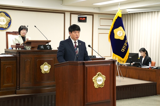 | ▲ 제270회 대전중구의회 제2차 정례회 제4차 본회의에서 오은규 의장이 발의한 2026년도 본예산안 수정안에 대해 제안설명을 하고 있다. |