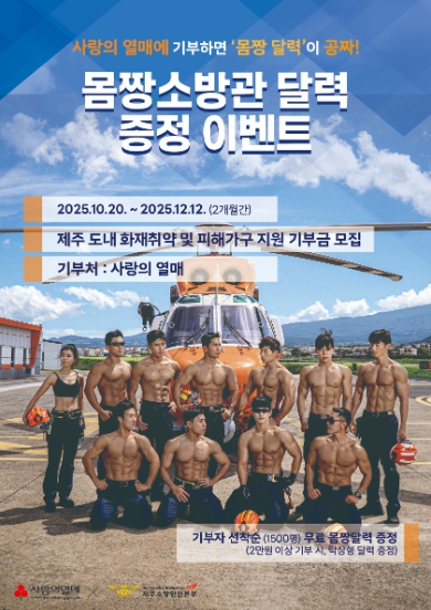 이번 이벤트는 사회복지공동모금회(회장 강지언)와 함께하며, 사랑의 열매 특별모금을 통해 2만원 이상 기부한 선착순 1,500명에게 ‘2026 제주 몸짱 소방관 달력 (탁상형(A4))’을 증정한다.
