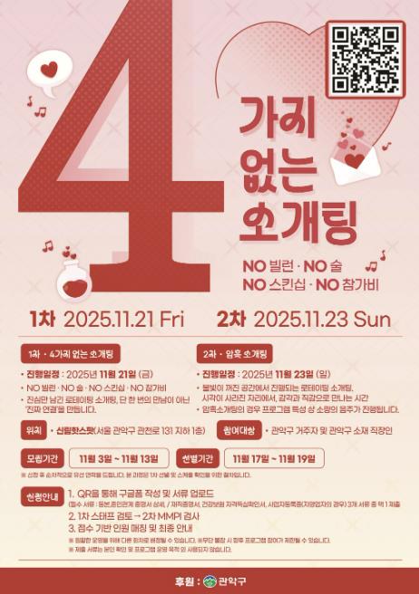 1회차 ‘4가지 없는 소개팅’은 11월 21일(금)에 로테이션 형식으로 진행된다. 4가지는 ▲NO 빌런 ▲NO 술 ▲NO 스킨십 ▲NO 참가비로, 참가자들은 각자에게 10분씩 주어지는 짧은 시간 동안 여러 사람과 돌아가며 대화를 나누게 된다. 사전에 작성한 소개카드를 통해 직업, 취미, MBTI 등 다양한 정보를 공유할 수 있으며, 대화 종료 후에는 상대방에 대한 인상을 메모로 기록한다. 최종적으로 마음에 드는 이성 두 명을 선택해 커플 매칭이 이루어진다.