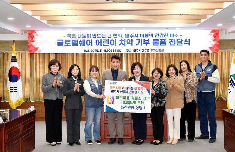 글로벌 쉐어는 국내외 아동 및 취약계층을 지원하는 비영리 구호단체로, 이번 기부를 통해 원주시 아동들의 올바른 구강관리 습관 형성과 건강한 치아 유지에 기여하고자 했다.