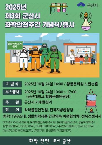 [뉴스다컴] ‘화학사고 없는 안전도시 군산’ 실현을 위해 오는 10월 20일부터 24일까지‘제3회 군산시 화학안전주간’행사가 열린다.