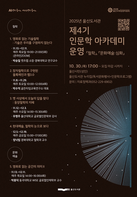 [뉴스다컴] 울산도서관은 오는 11월부터 `‘2025년 제4기 인문학 아카데미’를 운영한다고 밝혔다.