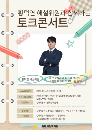 [뉴스다컴] 김제시립도서관은 오는 14일 금요일 19시부터 도서관 5층 배움터 3에서 ‘황덕연 해설위원과 함께하는 토크콘서트 내 꿈을 읽는 도서관’을 진행한다고 밝혔다