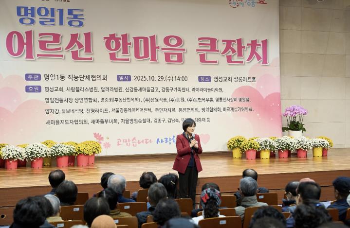 [뉴스다컴] 서울 강동구 명일1동은 지난 10월 29일 명성교회 샬롬아트홀에서 관내 어르신 250여 명을 모시고, ‘명일1동 어르신 한마음 큰잔치’를 성황리에 개최했다고 밝혔다.