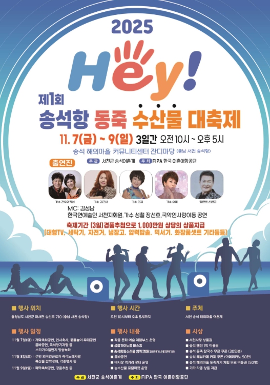 [뉴스다컴] 서천군 마서면 송석어촌계가 11월 7일부터 9일까지 사흘간 송석항 일원에서 ‘제1회 헤이(HEY) 송석항 동죽 수산물 대축제’를 연다.