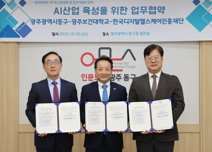 [뉴스다컴] 광주 동구는 지난 29일 구청 접견실에서 광주보건대학교(총장 김경태), 한국디지털헬스케어진흥재단(원장 박기원)과 인공지능(AI) 헬스케어 산업 육성, 인구 감소 해결, 원도심 활성화를 위한 업무협약을 체결했다고 밝혔다.