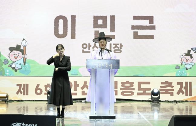 | ▲ 이민근 안산시장(오른쪽)이 지난 25일 화랑유원지 대공연장에서 열린 김홍도축제 개막식에서 인사 발언을 하고 있다. |