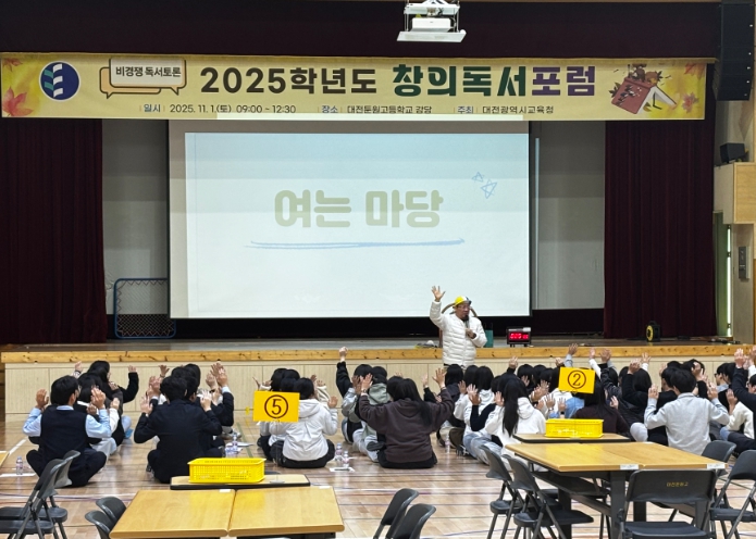 [뉴스다컴] 대전시교육청은 11월 1일 대전둔원고등학교에서 과정중심 독서활동에 기초한 독서‧토론 문화를 확산하기 위해 관내 고등학교 독서‧논술 동아리 15팀, 학생 60명과 지도교사가 참가한 가운데 ‘2025학년도 창의독서포럼’을 개최했다고 밝혔다.