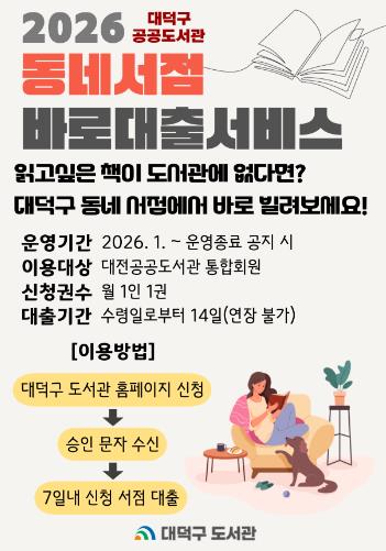 [뉴스다컴] 대전 대덕구는 2026년 공공도서관 ‘동네서점 바로대출 서비스’를 운영한다고 밝혔다.