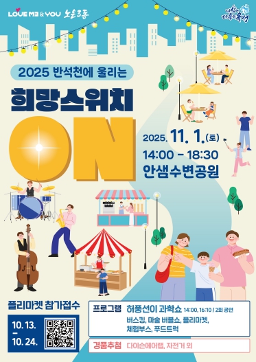 [뉴스다컴] 대전 유성구는 11월 1일 지족동 안샘수변공원에서 ‘2025 노은3동 반석천에 울리는 희망스위치 ON’ 행사를 개최한다.