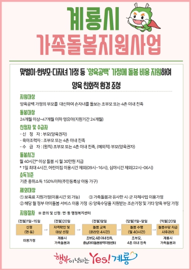 [뉴스다컴] 계룡시는 조부모 등 4촌 이내 친인척이 부모를 대신해 2~3세 영유아를 월 40시간 이상 돌봄을 제공할 경우 아이 1명당 월 30만원의 가족돌봄수당을 지급하는 ‘계룡시 가족돌봄지원 사업’을 11월 본격 시행한다고 밝혔다.