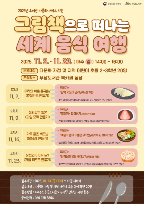 [뉴스다컴] 제주시 우당도서관은 2025년 도서관 다문화 서비스 지원 사업인 ‘그림책으로 떠나는 세계 음식 여행’ 프로그램 참여자를 10월 23일부터 선착순 모집한다.
