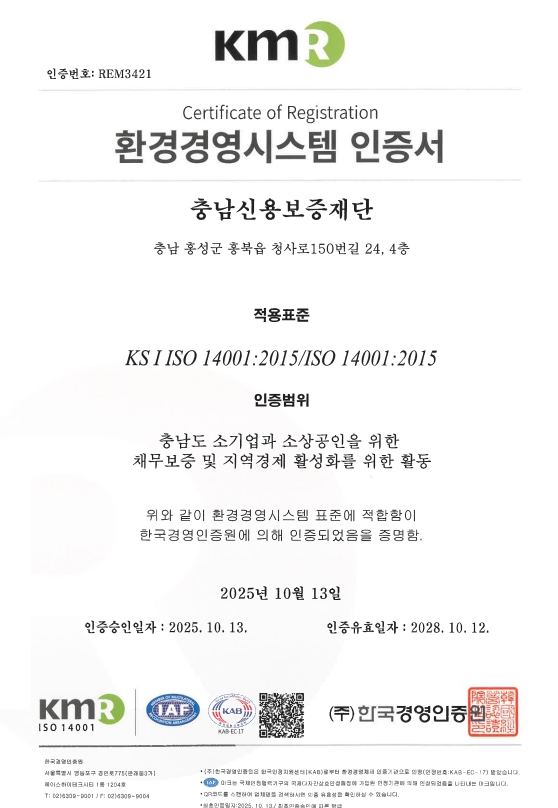▲ 충남신보, ISO 14001(환경경영시스템) 인증 취득 |