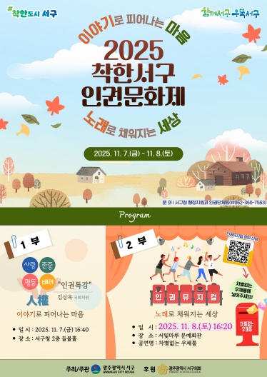 [뉴스다컴] 광주광역시 서구가 주민 참여 기반 인권문화 정착에 박차를 가한다. 서구는 오는 7일과 8일 이틀간 ‘이야기로 피어나는 마음, 노래로 채워지는 세상’을 주제로 ‘2025 착한서구 인권문화제’를 개최한다.