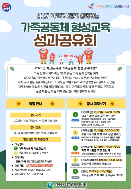 [뉴스다컴] 대구2·28기념학생도서관은 10월 15일부터 19일까지 학생, 학부모, 시민 등을 대상으로‘학교도서관과 함께하는 가족공동체 형성교육 성과공유회’를 개최한다.
