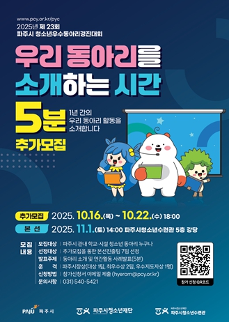 [뉴스다컴] (재)파주시청소년재단 파주시청소년수련관은 오는 10월 16일부터 10월 22일까지 “제23회 파주시 청소년우수동아리경진대회”의 참가 동아리를 모집한다.