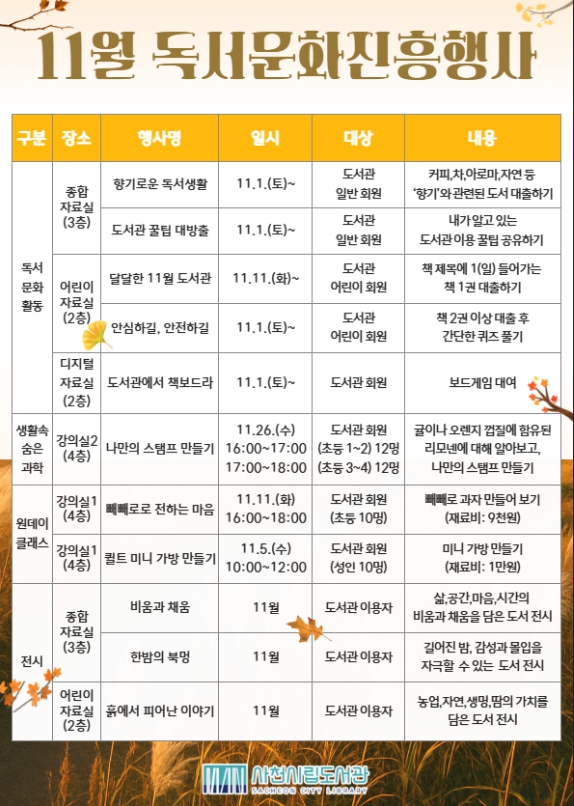[뉴스다컴] 사천시는 사천시립도서관에서 11월 한 달 동안 책과 함께 여유로운 시간을 보내며 감성을 채울 수 있는 다양한 독서문화행사와 체험 프로그램을 운영한다고 17일 밝혔다.