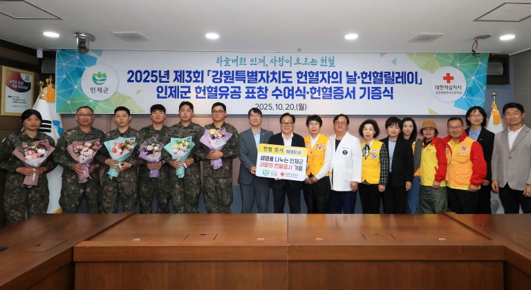 [뉴스다컴] 인제군은 ‘2025 헌혈자의 날’을 기념해 지난 10월 20일 인제군청 소회의실에서 헌혈유공자 12명에게 인제군수 표창을 수여하고, 헌혈증서 1,000매를 강원혈액원에 기부했다고 밝혔다.