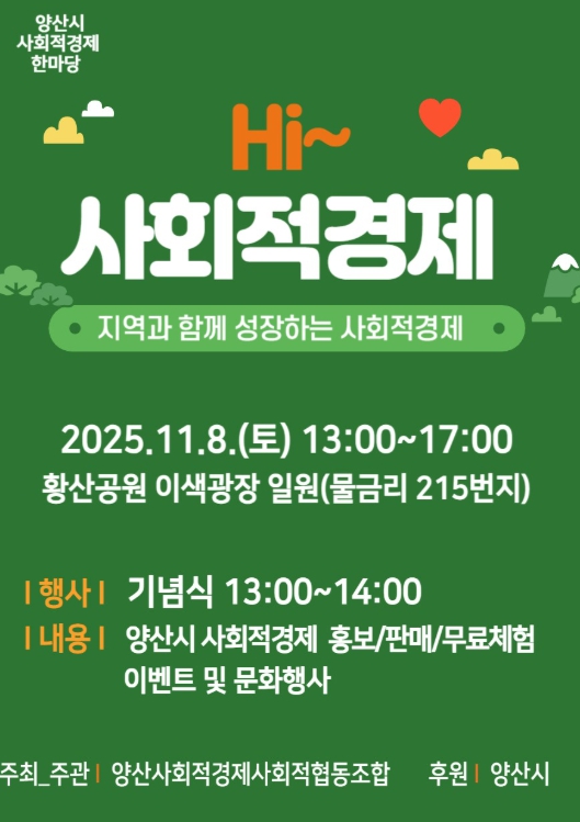 [뉴스다컴] 양산시는 오는 8일 오후 1시부터 오후 5시까지 황산공원 이색광장 일원에서 2025년 사회적경제 한마당(부제‘Hi~ 사회적경제’) 행사를 개최한다.