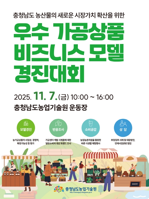 [뉴스다컴] 충남도 농업기술원은 오는 11월 7일 농가공경영체와 전문가, 일반 소비자 등 300여 명이 참석한 가운데 ‘2025년 우수 가공상품 비즈니스 모델 경진대회’를 개최한다고 30일 밝혔다.
