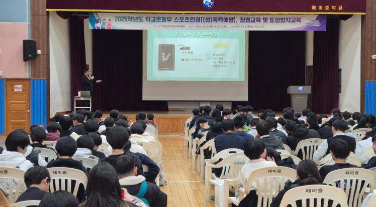 [뉴스다컴] 충청남도서산교육지원청은 지난 28일, 해미중학교 체육관과 해미도서관에서 학생선수, 운동부 지도교사, 운동부 지도자, 전문스포츠지도자를 대상으로 한 '2025학년도 학교운동부 스포츠인권((성)폭력예방), 청렴교육 및 도핑방지교육'을 실시했다.
