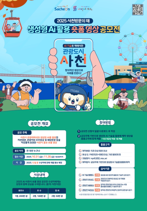 [뉴스다컴] 사천시는 2025 사천방문의 해를 맞아 시의 관광자원과 관광 캐릭터에 대한 관심과 인지도를 제고하기 위한 생성형 AI 활용 숏폼 영상 공모전을 10월 31일부터 11월 28일까지 개최한다.