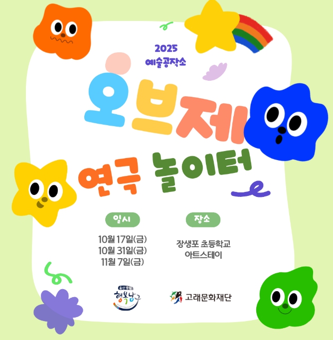 ‘오브제 연극 놀이터’는 일상 속 오브제(사물)를 소재로 삼아 자신만의 이야기를 만들고 표현하는 참여형 예술교육 프로그램으로 전문 연극 강사와 함께 놀이처럼 진행되며 참가자들이 창의력과 표현력, 협동심을 자연스럽게 기를 수 있는 것이 특징이다.