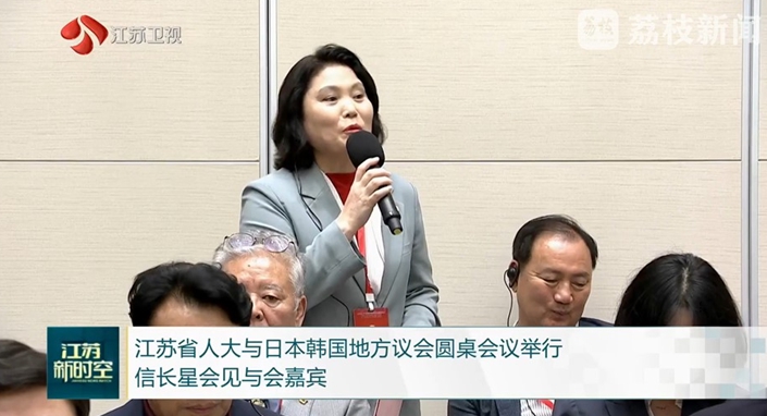▲ 장쑤성 인민대표대회와 한·일 지방의회 의원 원탁회의에서 의견을 발표하는 박춘선 부위원장 |