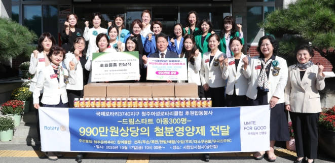 [뉴스다컴] 청주시 국제로타리3740지구 소속 9개 여성로타리클럽은 17일 청주시청을 찾아 성장기인 취약계층 아동(드림스타트)을 위해 영양제를 기탁했다.