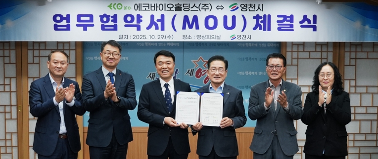 [뉴스다컴] 영천시는 29일 시청 영상회의실에서 최기문 시장, 송효순 에코바이오홀딩스㈜ 대표 등 관계자들이 참석한 가운데 ‘바이오가스 기반 청정수소 생산 통합사업’에 관한 업무협약(MOU)을 체결했다.