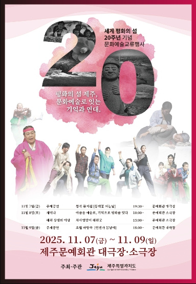 [뉴스다컴] 제주특별자치도는 세계평화의 섬 20주년을 기념해 ‘평화의 섬 제주, 문화예술로 잇는 기억과 연대' 주제로 7일부터 9일까지 3일간 제주문예회관에서 문화예술 교류 행사를 개최한다.