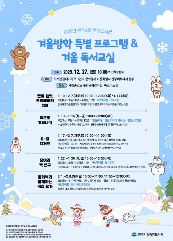 [뉴스다컴] 원주시립중앙도서관은 겨울방학을 맞아 유아부터 청소년을 대상으로 겨울방학 특별 프로그램과 겨울 독서교실을 운영한다.