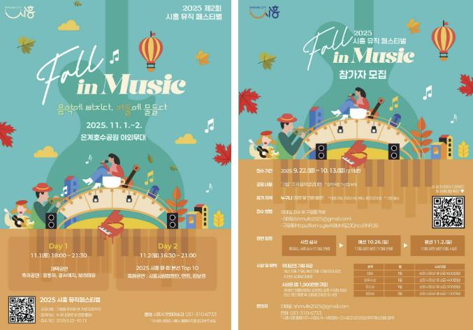 [뉴스다컴] 시흥시는 오는 11월 1일부터 2일까지 시흥 은계호수공원에서 ‘2025년 제2회 시흥뮤직페스티벌’ 개최를 앞두고 참가팀을 모집한다. 올해 페스티벌 주제는 ‘시흥 Fall in Music -음악에 빠지다, 가을에 물들다- ’로 ‘가을’을 주제로 한 다양한 장르의 전국 단위 음악경연대회 및 축하공연으로 꾸며진다.