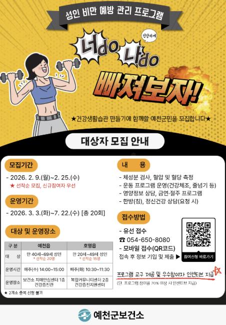 [뉴스다컴] 예천군은 성인 비만 예방과 건강한 생활 습관 형성을 위해 ‘2026년 성인 비만 예방 관리 프로그램’ 참여 대상자를 9일부터 25일까지 선착순으로 모집한다.
