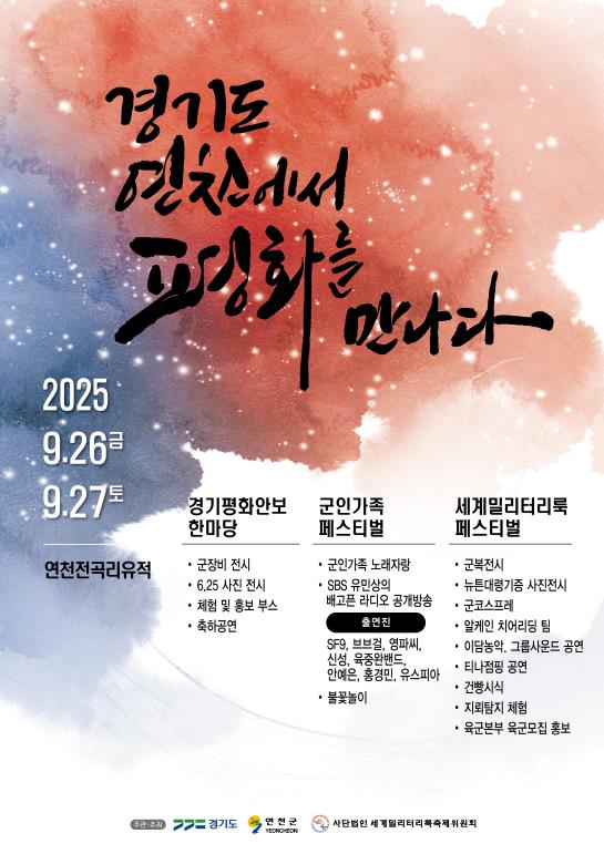 [뉴스다컴] 경기도는 9월 26일과 27일 이틀간 연천군 전곡리유적에서 ‘2025년 경기 평화안보 한마당’을 개최한다. ‘연천 군인가족 페스티벌’과 함께 진행될 예정인 이날 행사는 도민과 군인가족이 함께 평화와 안보의 가치를 공유하는 소통과 화합의 장으로 마련했다.