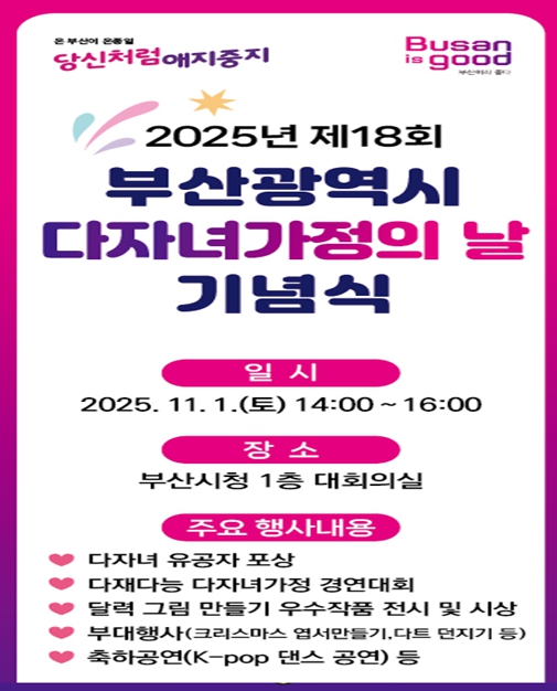 11월 1일은 다자녀가정 우대 문화 확산과 출산‧양육 친화적 사회 분위기 조성을 위해 부산시가 정한 다자녀가정의 날이다.