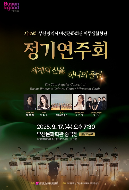 [뉴스다컴] 부산시 여성문화회관은 오는 9월 17일 오후 7시 30분 부산문화회관 중극장에서 '제26회 미루샘합창단 정기연주회'를 개최한다고 밝혔다.