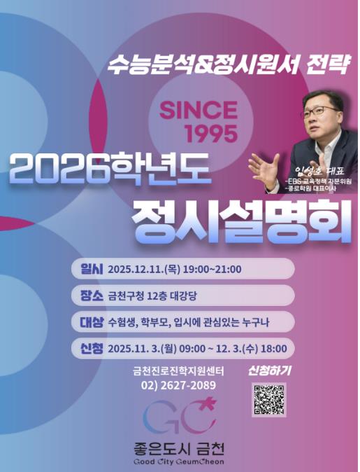 [뉴스다컴] 금천구는 2026학년도 정시모집을 앞둔 수험생과 학부모를 위해 12월 11일 청사 대강당에서 진행하는 ‘2026학년도 대학입학 정시 설명회’의 참여 신청을 받는다고 밝혔다.